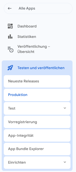 - Klicke links im Menü auf "Testen und Veröffentlichen" und dann auf "Produktion":
