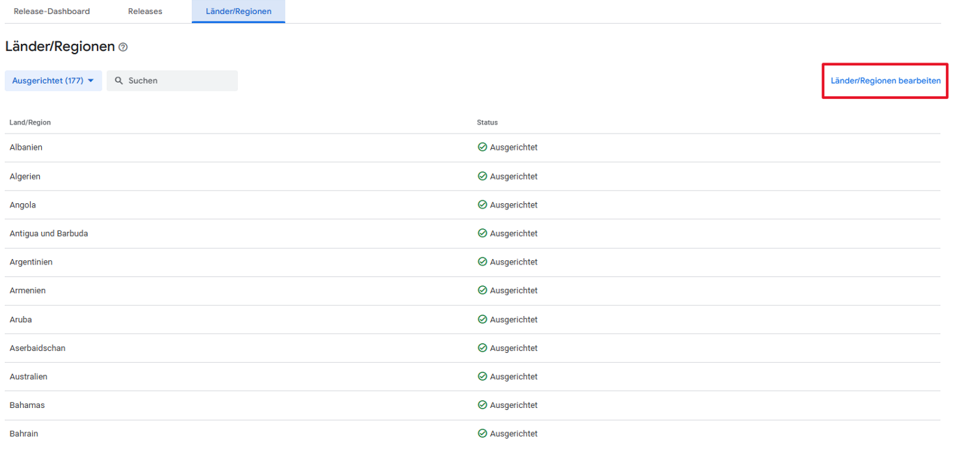 - Unter dem Tab "Länder/Regionen" siehst du nun, in welchen Ländern deine App aktuell veröffentlicht wird - im Normalfall sind dabei alle ausgewählt. Oben rechts kannst du nun auf "Länder/Regionen bearbeiten" klicken:
