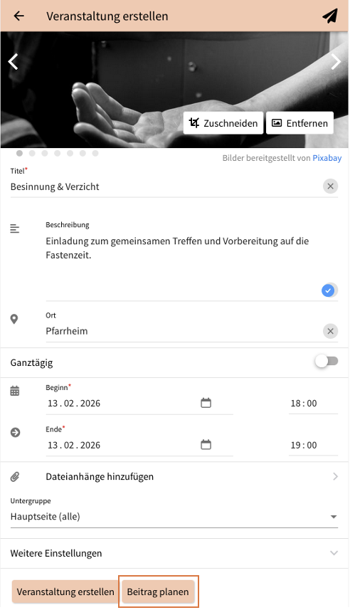 1. Um einen geplanten Beitrag zu erstellen, klickst du zunächst auf das Plus-Symbol „Neu erstellen“ und wählst zum Beispiel „Neue Veranstaltung“. Danach trägst du wie gewohnt alle relevanten Informationen ein, also das Titelbild, den Titel, die Beschreibung sowie organisatorische Details wie Datum und Uhrzeit der Veranstaltung.