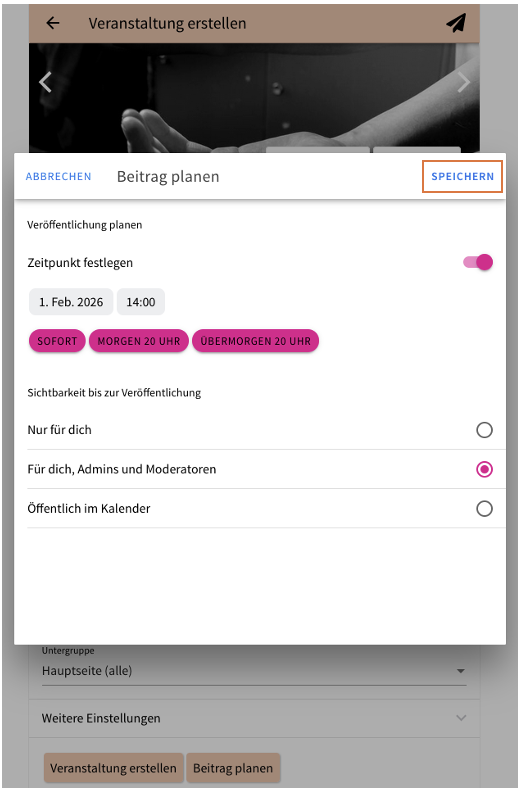 Zusätzlich kannst du einstellen, wer den Beitrag bis zur Veröffentlichung sehen kann. Dabei stehen mehrere Optionen zur Verfügung: Du kannst den Beitrag nur für dich sichtbar machen, ihn für dich sowie für Admins und Moderatoren freigeben oder ihn bereits öffentlich im Kalender anzeigen lassen, sodass jeder ihn unter „Geplante Beiträge“ sehen kann.